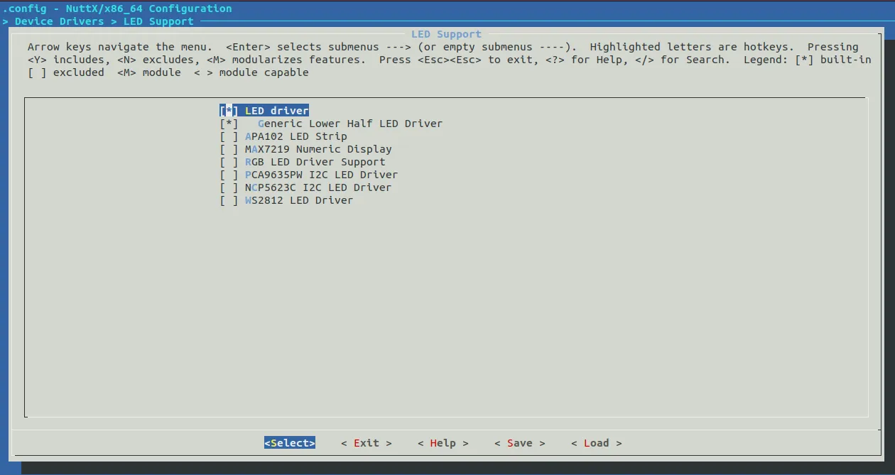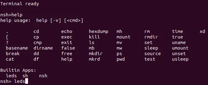 ✓As a shortcut, you may load the leds config instead of nsh. If you do so, you don’t need to enter the configuration menu. This config has everything included for you. It’s nice to try both to realize how configs may be used to try functionalities faster but it’s also nice to get familiar with the menuconfig options.