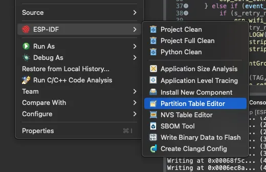 To create the partition table file, use the Partition Table Editor from the Espressif-IDE. To open the editor, right-click on the project, ESP-IDF -> Partition Table Editor: