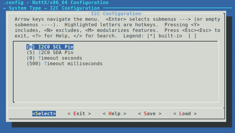 To enable the MPU6050 IMU, start by running make menuconfig in the NuttX project directory. Navigate to System Type → Peripheral Support and enable I2C0. On ESP32-C6 this should set GPIOs 6 and 5 as SCL and SDA pins, respectively. To verify, enter System Type → I2C Configuration to see the designated GPIOs.
