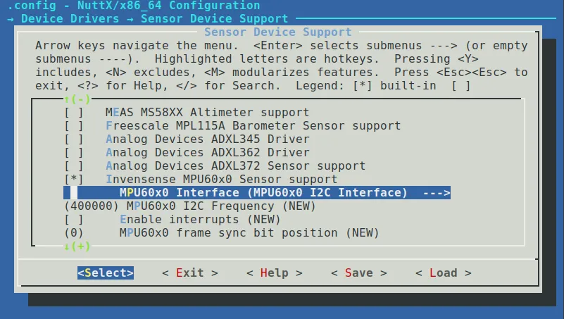 Then, go to Device Drivers → Sensor Device Support and enable the Invensense MPU60x0 Sensor support driver. Make sure to also select the MPU60x0 I2C Interface option, instead of SPI. Once these options are set, save your configuration and proceed to build the firmware.