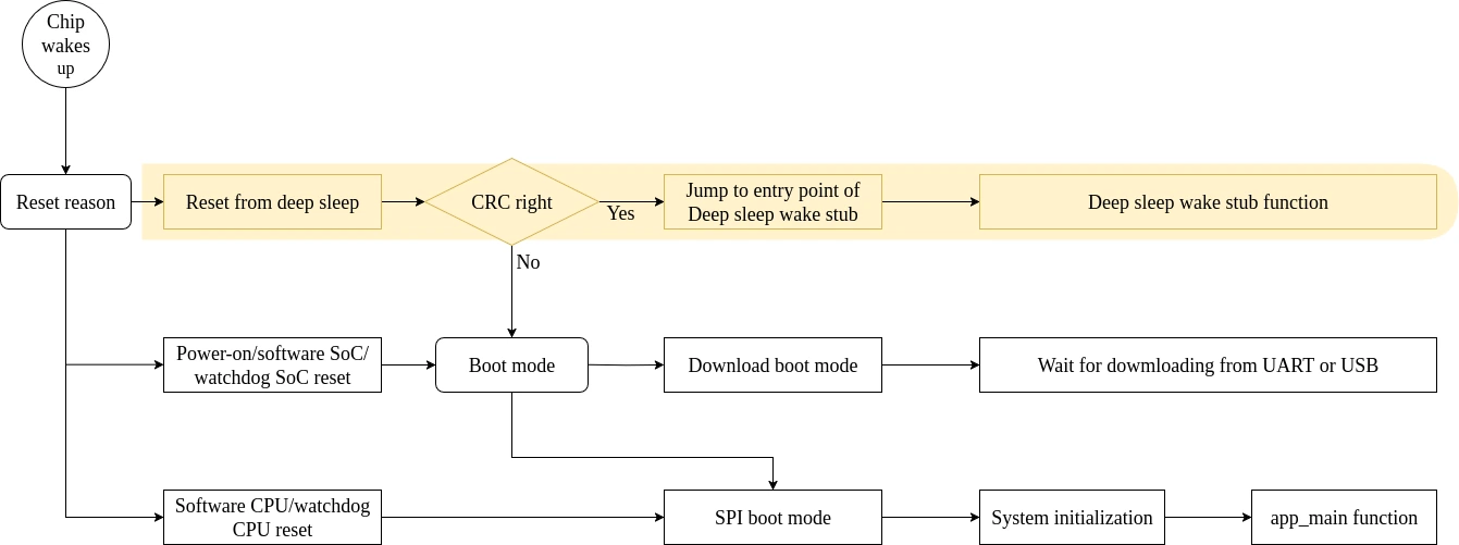 Reset from deep sleep: After partial initialization, the CPU performs a CRC check on the RTC/LP memory to ensure the data is valid. If the check passes, the CPU jumps to the entry point of the Deep-sleep wake stub application stored in RTC/LP Memory and begins execution. Otherwise, it proceeds with SPI boot mode.