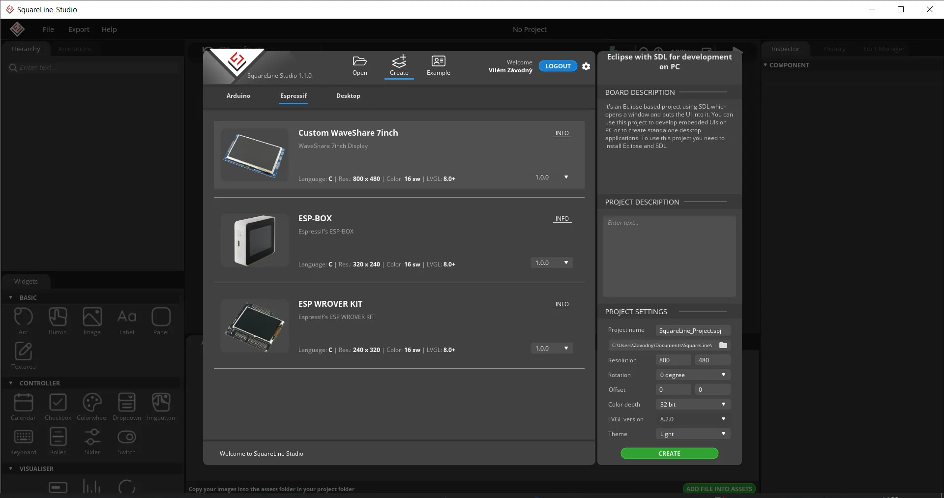 After launching the SquareLine Studio, you should see your board in the Create tab and Espressif tab. There should be your board name, description and image.