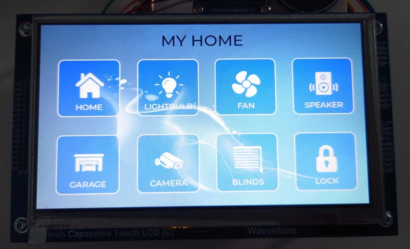 For this example we have selected the following LCD display: WaveShare 7inch 800x480 with RA8875 graphical controller and GT911 touch screen controller.