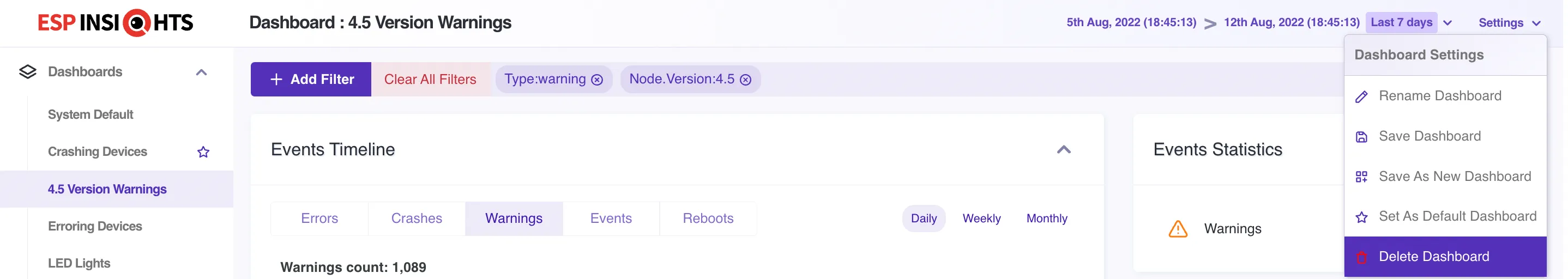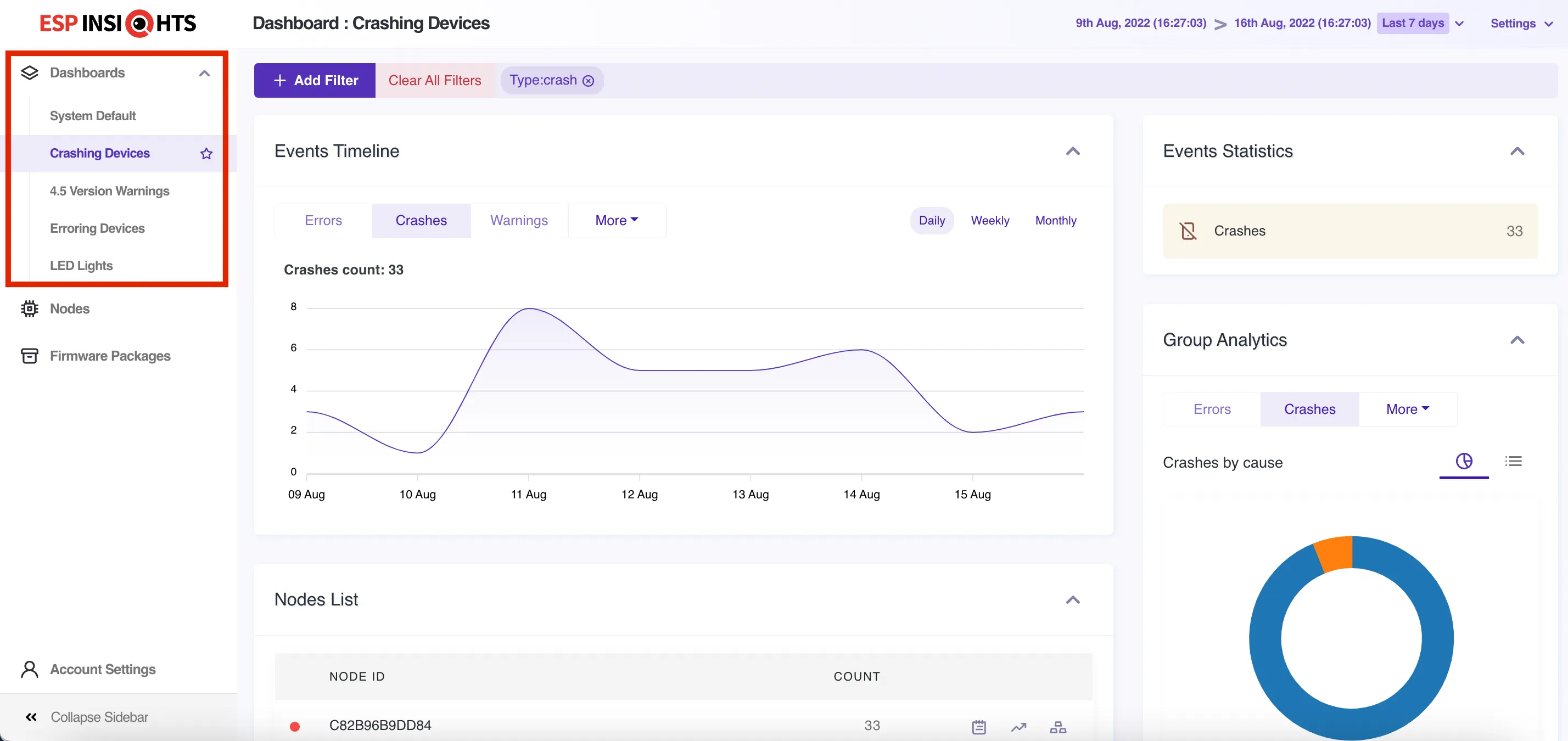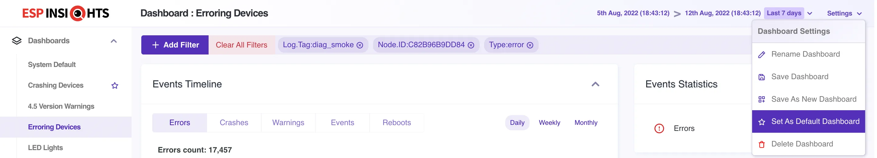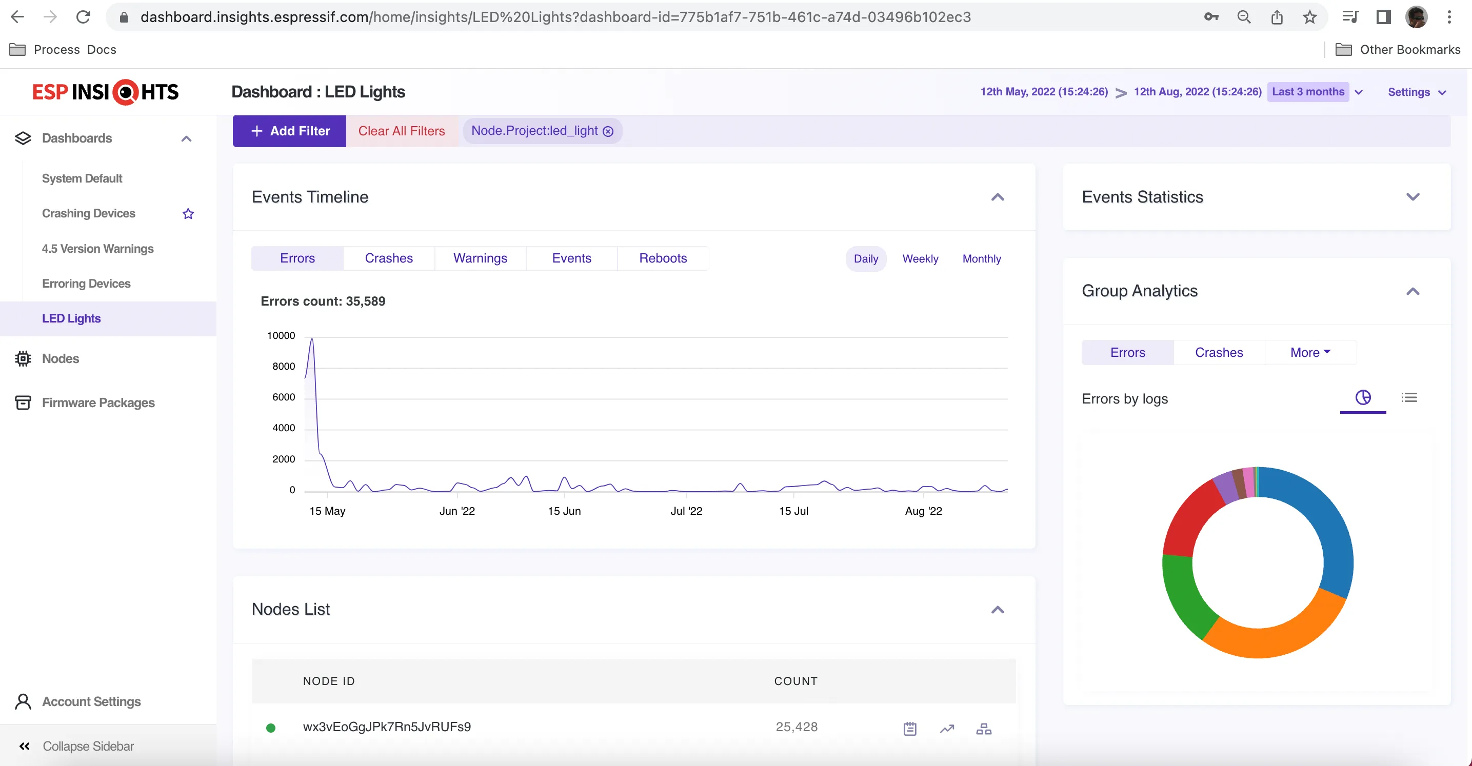 As can be seen in the above image, there are multiple dashboards created, each for a different purpose, and filtering devices accordingly. While the “Crashing Device Dashboard” lists devices reporting crashes in last 7 days, there is another dashboard named “LED Lights” which just lists devices with firmware project as “led_lights”.