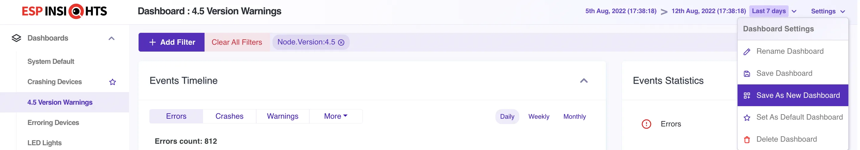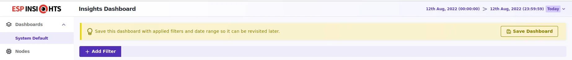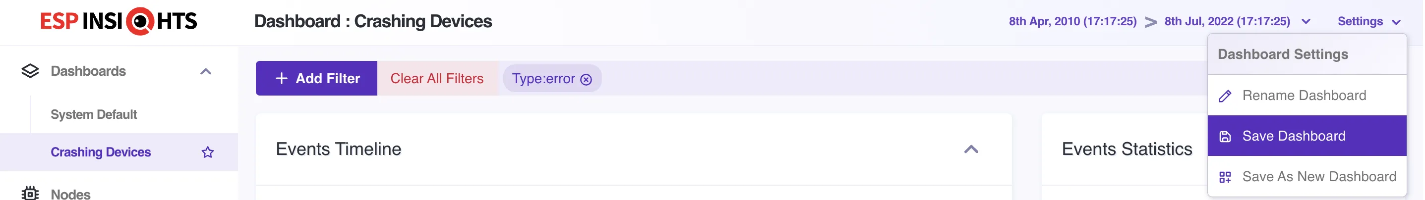 Each ESP Insights user may have a different perspective of looking at their device data. A user in developer role , may be using the dashboard more from diagnostics purposes and interested in understanding the crashing devices or the reboot pattern of devices. Whereas another user in product manager role might be using it from analytics insights purposes and interested in just looking at the spread of online devices of particular type(s) and at particular times in a day or a week or a month. In order to cater to individual perspectives, sticking to just one default view and asking the user to set the filters every single time was not scoring on the user experience. Thus came the improvement to make it easier for the end users to save their custom dashboard with their search filters applied and preserved. A user can save multiple dashboards as per their need and intention of use viz. Crashing Devices Dashboard or Led Light v5.0 Devices (light devices with firmware version 5.0) and so on so forth.