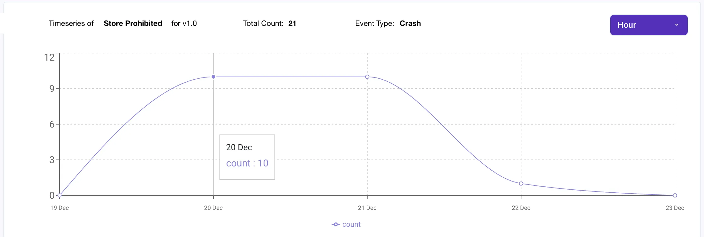 - Counts grouped by events (for e.g., Errors) for a particular project and version, in a selected time interval. You can change the interval to hour or aggregate to week or a month interval