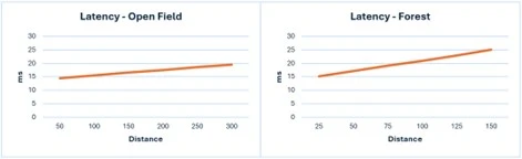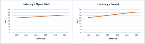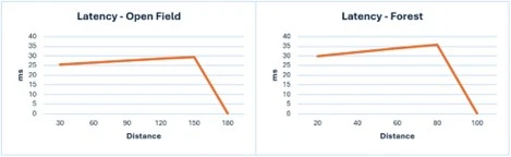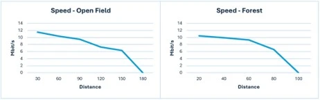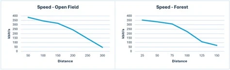 Speed in open fields reached a maximum of 400 kbps at close ranges, gradually dropping to 50 kbps at 300 meters. In dense forests, speeds started at around 350 kbps at 25 meters but declined more quickly, reaching just 50 kbps by 150 meters.