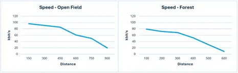 Speed in open fields started at 100 kbps at 150 meters and declined steadily to about 10 kbps at 900 meters. In dense forests, the speed remained at 80 kbps up to 200 meters but saw a sharp decline beyond 400 meters.