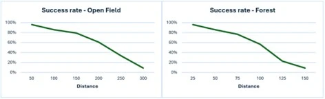 Success rates in open fields remained high at close ranges but fell to around 60% by 150 meters. In forested conditions, Wi-Fi success rates declined more quickly, dropping below 50% at 80 meters, highlighting its vulnerability to obstructions.