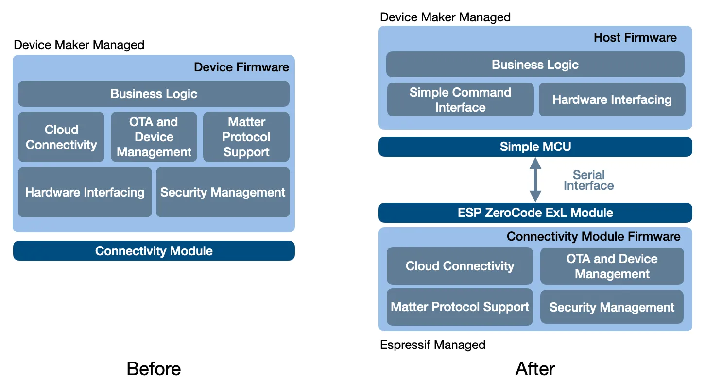 - The addition of the Matter protocol adds to this making the development, maintenance, and certification even more complex. The ESP ZeroCode ExL module moves this important yet undifferentiated workload onto a separate module, allowing device makers to easily build the hardware interfacing and business logic onto the host MCU.