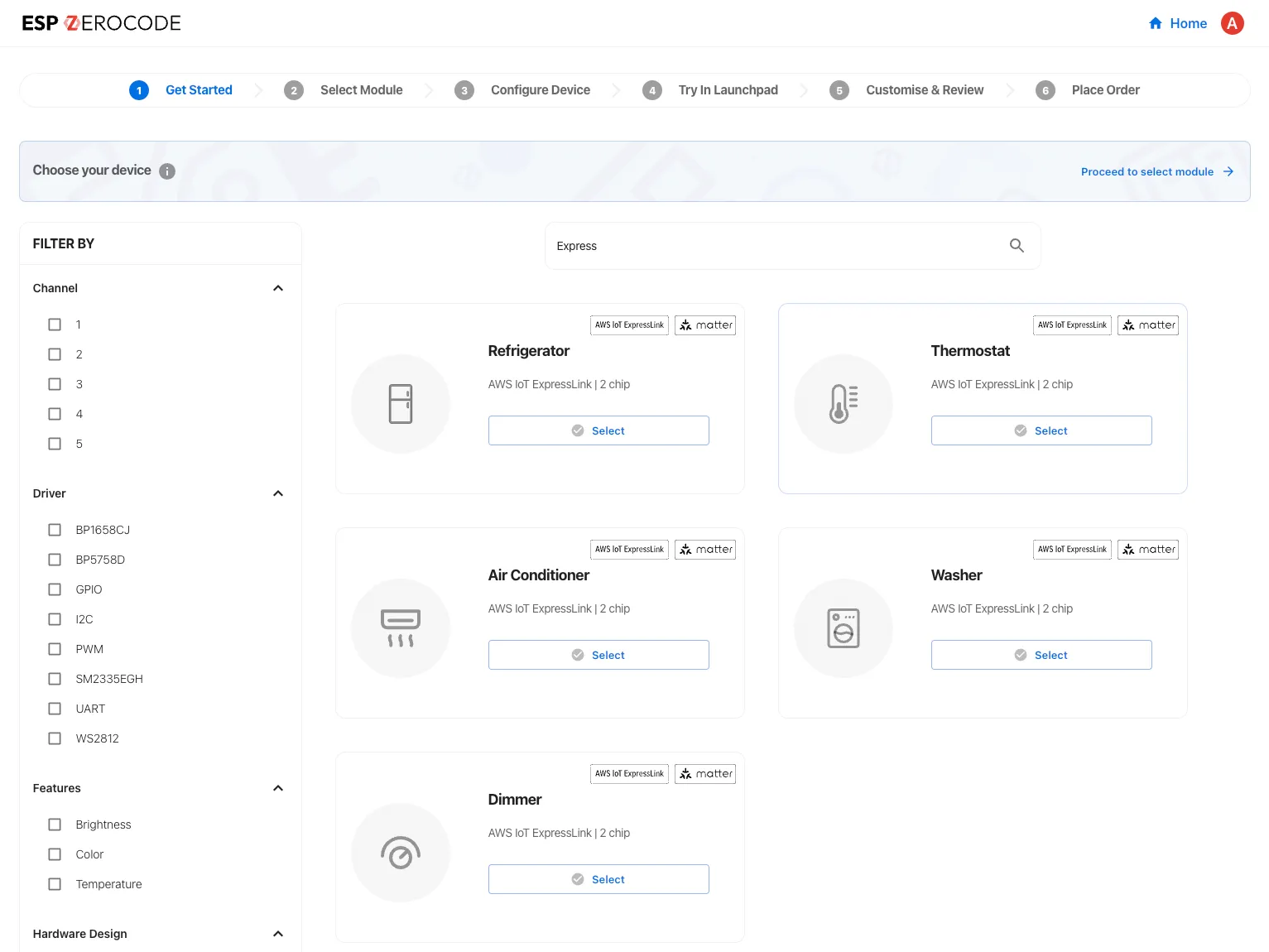 Espressif provides an easy evaluation through the ESP ZeroCode Console for the ESP ZeroCode ExL module. You can use any ESP32-C6 development board to quickly try out the functionality completely in the web browser. ESP ZeroCode Console supports a refrigerator, laundry washer, air conditioner, thermostat, and dimmer device types with ESP ZeroCode ExL module. We will be soon expanding on these device types.