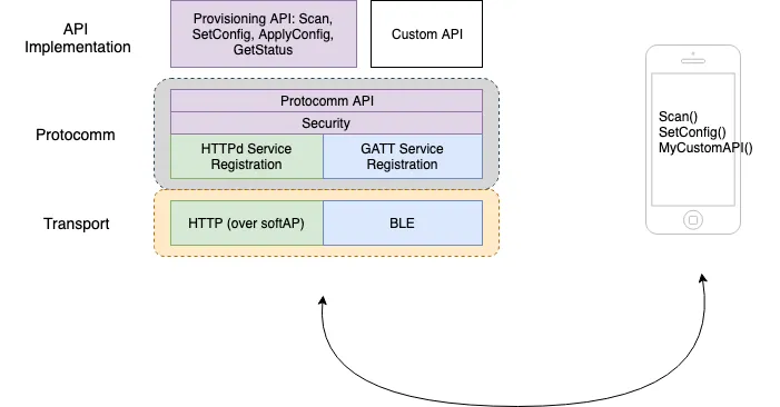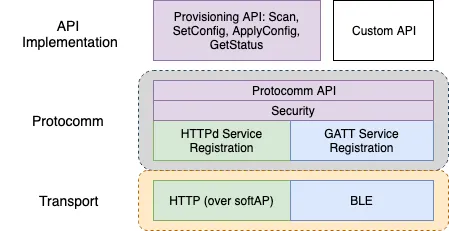 - Protocomm: The protocomm layer provides a secure abstraction for the higher level APIs. The protocomm layer takes care of registering the API as a HTTPd service API, or a GATT-level API. Additionally, the protocomm layer ensures that data exchange that happens over the API happens over a secure channel.