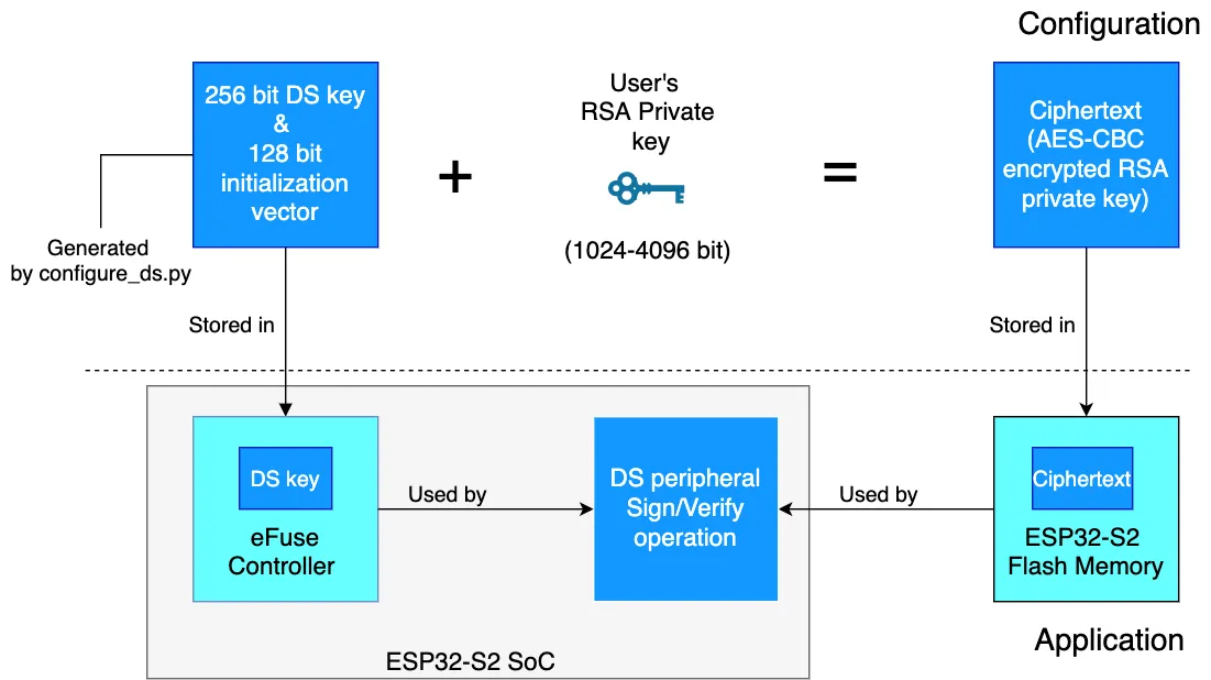 The Digital Signature (DS) peripheral is a new security feature introduced in the Espressif’s ESP32-S2 SoC. This peripheral is also available in ESP32-C3 and ESP32-S3 SoCs. It produces hardware accelerated RSA digital signatures, without the RSA private key being accessible by software. This allows the private key to be kept secured on the device without anyone other than the device hardware being able to access it.