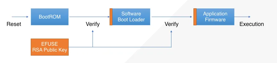 Secure Boot allows the ESP32-S2 to boot only trusted code. The BootROM (which can’t be modified and is trusted) verifies the software bootloader and software bootloader then verifies the application firmware to be trusted (authenticated) one. This is transitive trust model to ensure that the application is fully trusted.