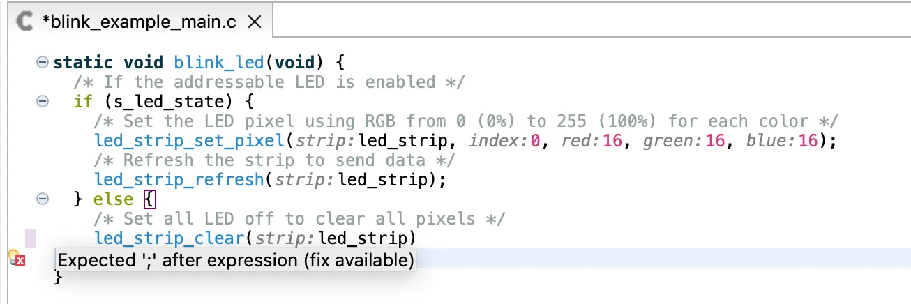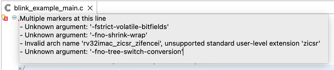 compile_commands.json) is a file that contains an array of command objects, each representing a single compilation unit, providing details like the compiler executable, the compiler flags used, the source files, and the working directory. This database is used by clangd to determine how the source code is compiled.Remove: This key lists the patterns, meaning that any compilation flags that start with-mor-fshould be removed from the compilation commands. This is needed to remove some errors reported by clangd because Espressif-IDE uses the GCC toolchain by default to build projects. If you choose to use the experimental esp-clang toolchain, this key is not needed.Here are the errors you may find in the file if you haven’t added the remove flags as mentioned above.