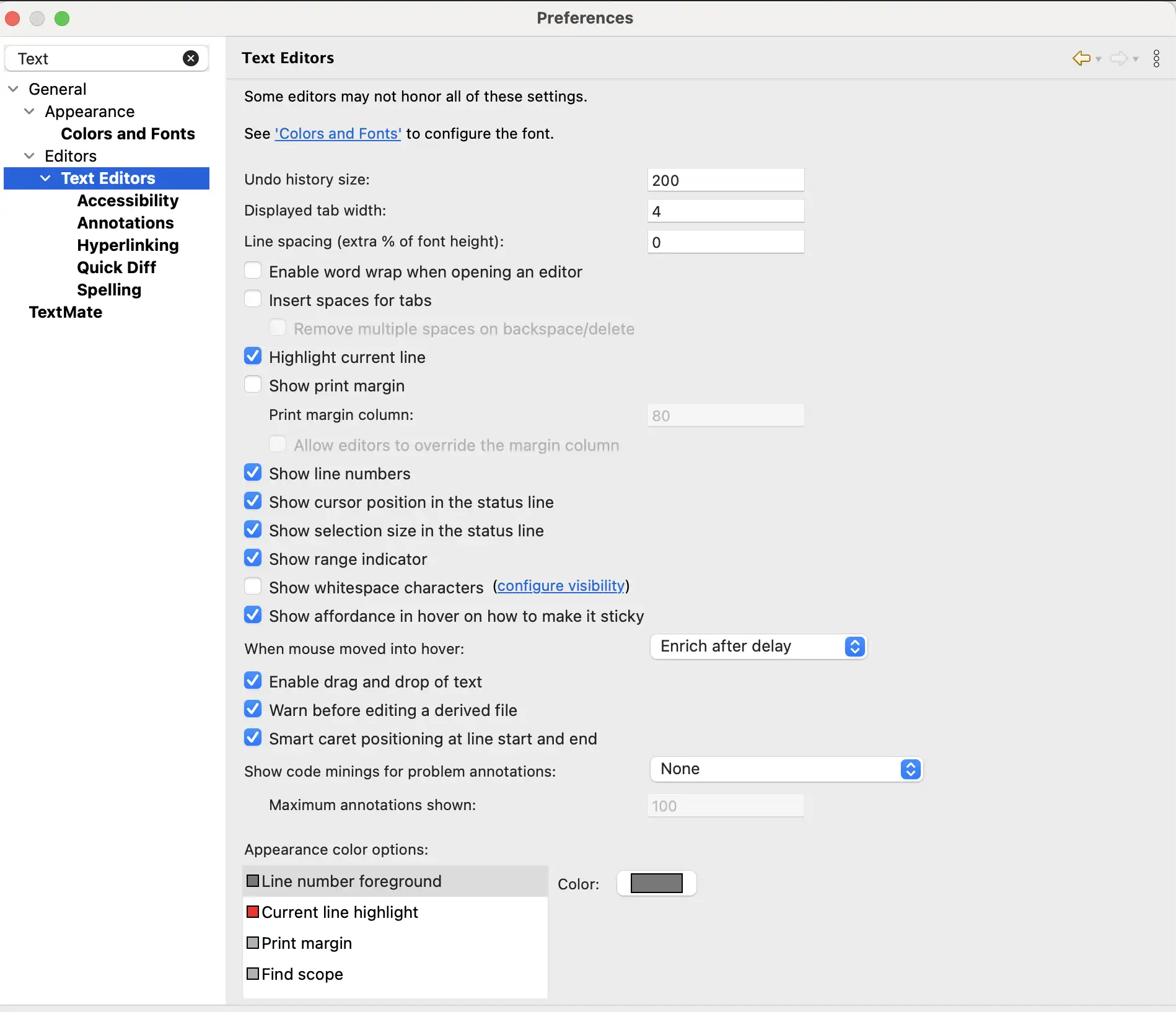 The LSP C/C++ Editor is derived from the standard Eclipse Text Editor, so you can change the editor color options from the Text Editor preferences. For example, you can modify the line number foreground color and the current line highlight color, among other options available in the Text Editor preferences.