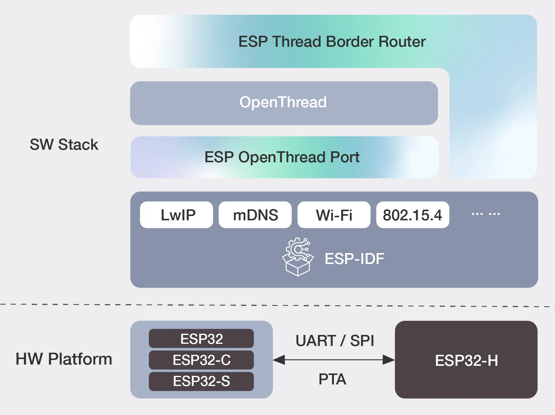 ESP Thread BR solution is based on the combination of Espressif’s Wi-Fi and 802.15.4 SoCs, built on the ESP-IDF and open-source OpenThread stack.