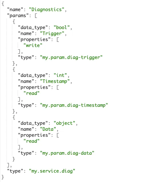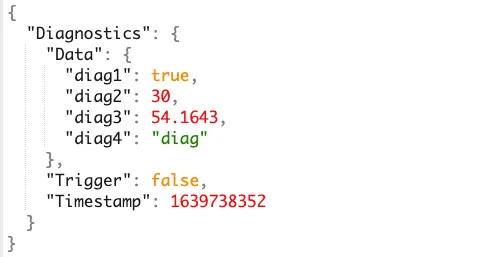If the overall number of values in diagnostic data is small, it would be ok to define separate integer/bool/float/string parameters for each (“Timestamp” in above example). But if the data is going to be large, it is recommended to use an “object” type (“Data” in above example) and then pass whatever JSON object you want.