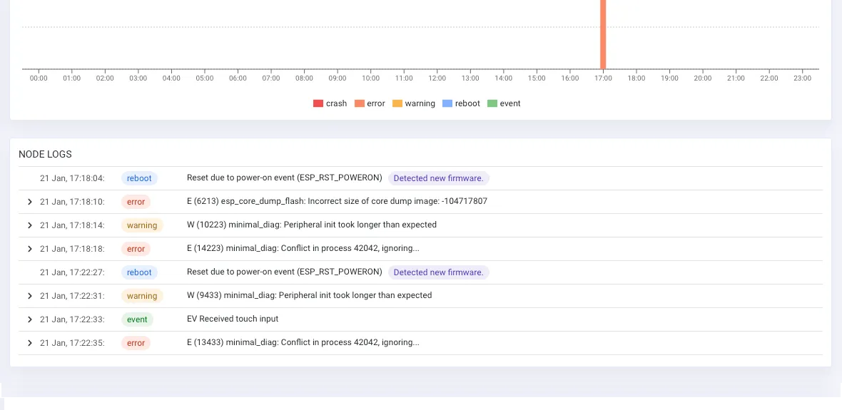 - Turn-around time for fixing issues is much shorter for developers that have rich information about issues. Most teams spend enormous amounts of time recreating issues based on the scanty user-visible symptoms reported to them. ESP Insights captures and reports details about errors or warnings as observed on the device firmware. Of particular interest are events generated just before a crash. ESP Insights preserves these events across a device reset, so that it is reported to the cloud once the device is back up again.
