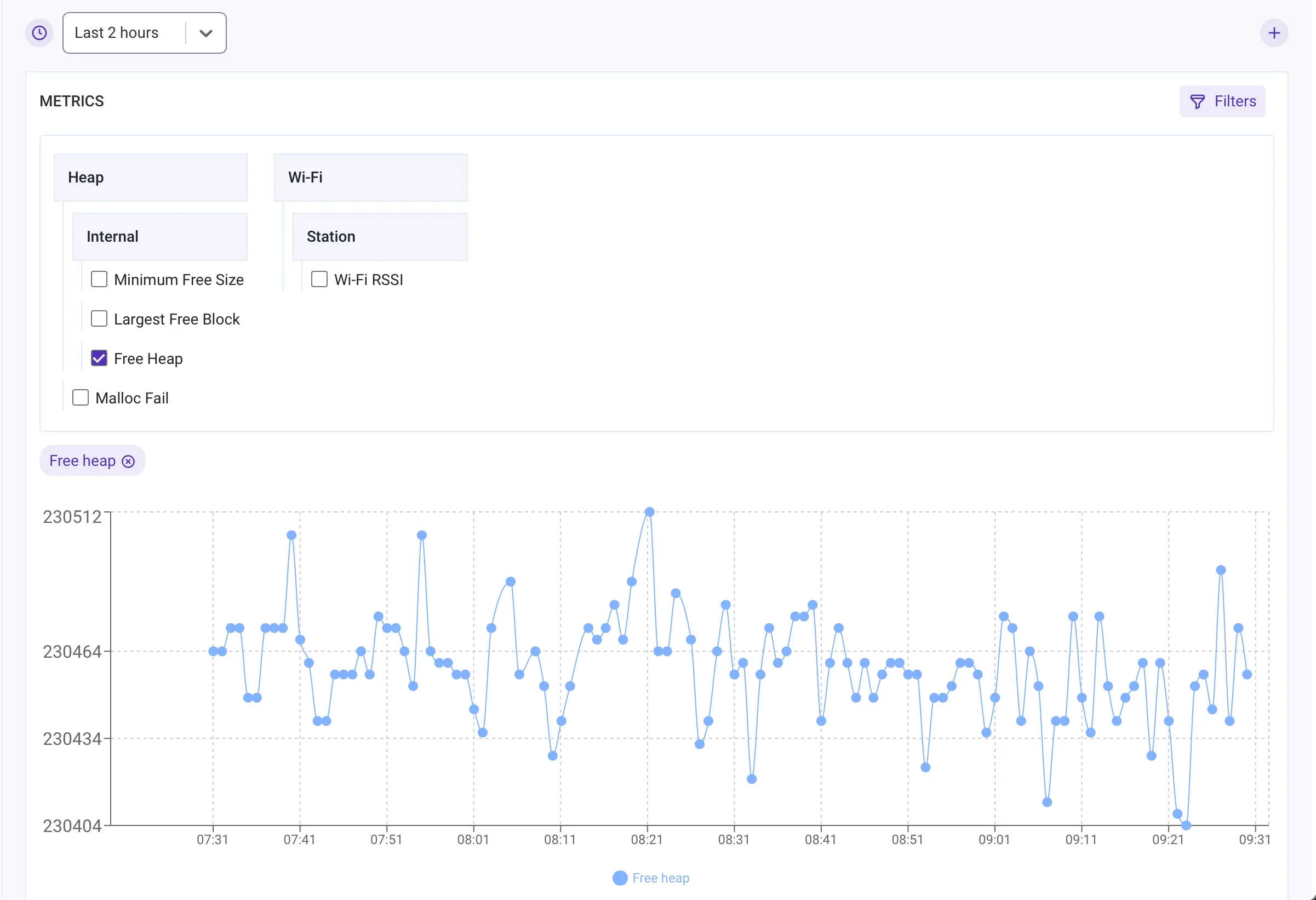 - You can observe firmware metrics like the amount of free heap over a timeline.