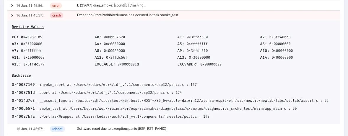 - Detailed Crash Backtraces on the ESP Insights console allow developers to start working on issues even before customers may notice them.