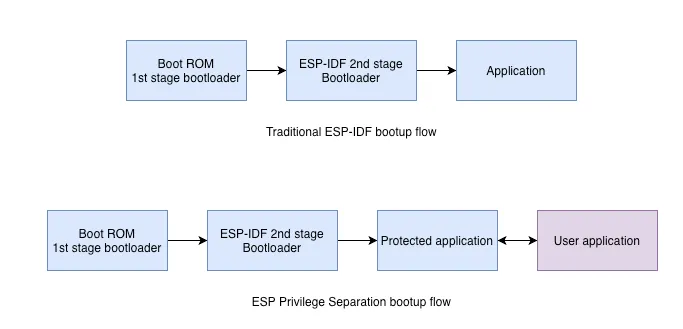 In ESP Privilege Separation, the bootup flow is like ESP-IDF application bootup flow, the Boot ROM (1st stage bootloader) verifies and loads the 2nd stage ESP-IDF bootloader from the flash. The 2nd stage bootloader then verifies and loads the protected application. Protected application checks for valid user application header in flash and if found, it sets appropriate permissions and tries to verify and load the user application.