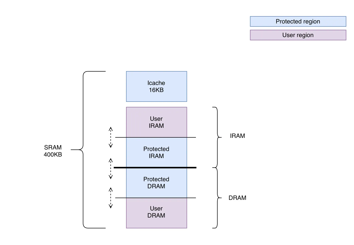 The following figure represents how the SRAM is split between protected and user application. SRAM is divided into IRAM and DRAM and this split is entirely configurable and dependent upon the usage of the application.