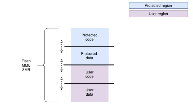 The following figure represents how the Flash virtual memory is split between protected and user application. Like internal memory split, flash MMU range is divided into .rodata and .text sections and is entirely configurable.