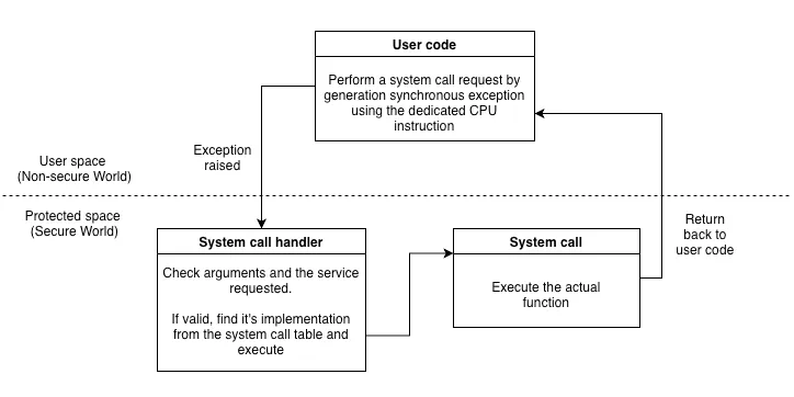 Protected application provides a standard “system call” interface through which user application can request access to core services. This uses a special CPU instruction that generates a synchronous exception that hands over the control to a protected application. The system call handler carefully checks the request and performs action accordingly. The following diagram gives an overview of how the system call interface is implemented: