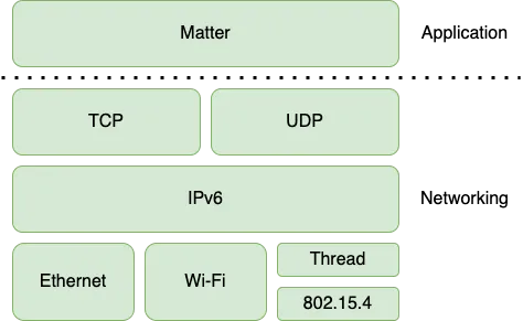 Matter defines a common application layer, using Internet Protocol (IP) , that delivers interoperability among devices regardless of the underlying network protocol. At launch, Matter will run on Ethernet, Wi-Fi and Thread.
