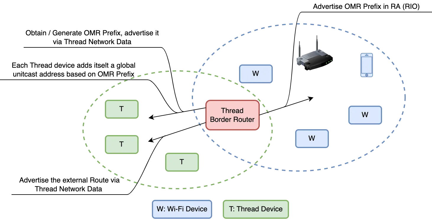 Thread BR configures its Thread partition with an Off-Mesh Routable (OMR) prefix, each Thread device adds an OMR address as the Global unicast address. Thread BR announces reachability of this OMR Prefix to Wi-Fi network by sending Router Advertisement (RA) which contains an IPv6 Route Information Option (RIO).