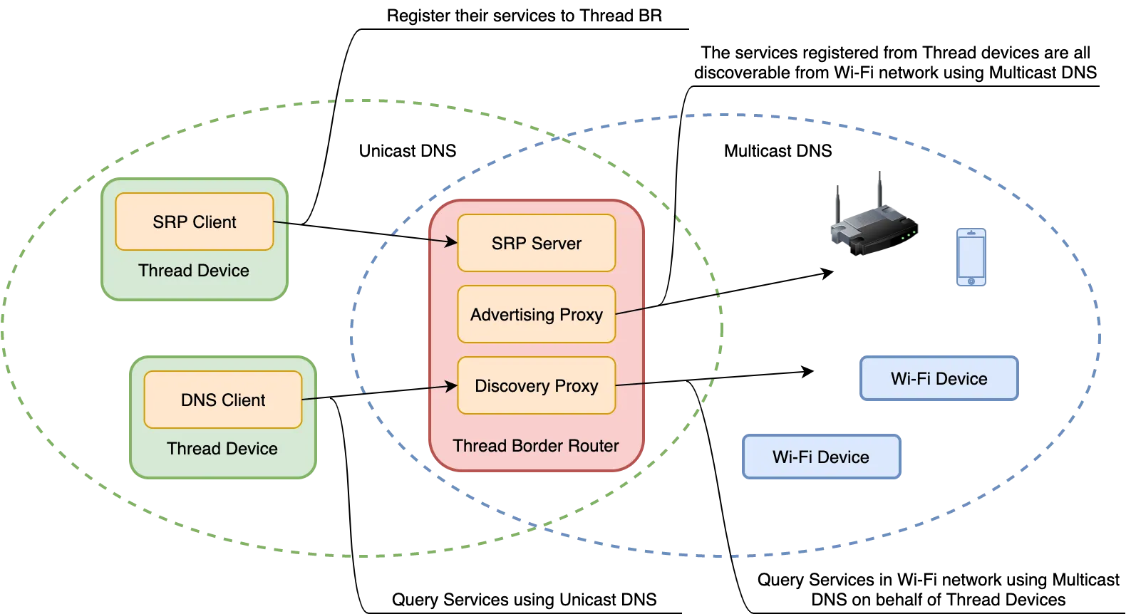 The Thread Border Router also implements DNS-SD Discovery Proxy, to enable clients on the Thread network to discover services from Wi-Fi network.