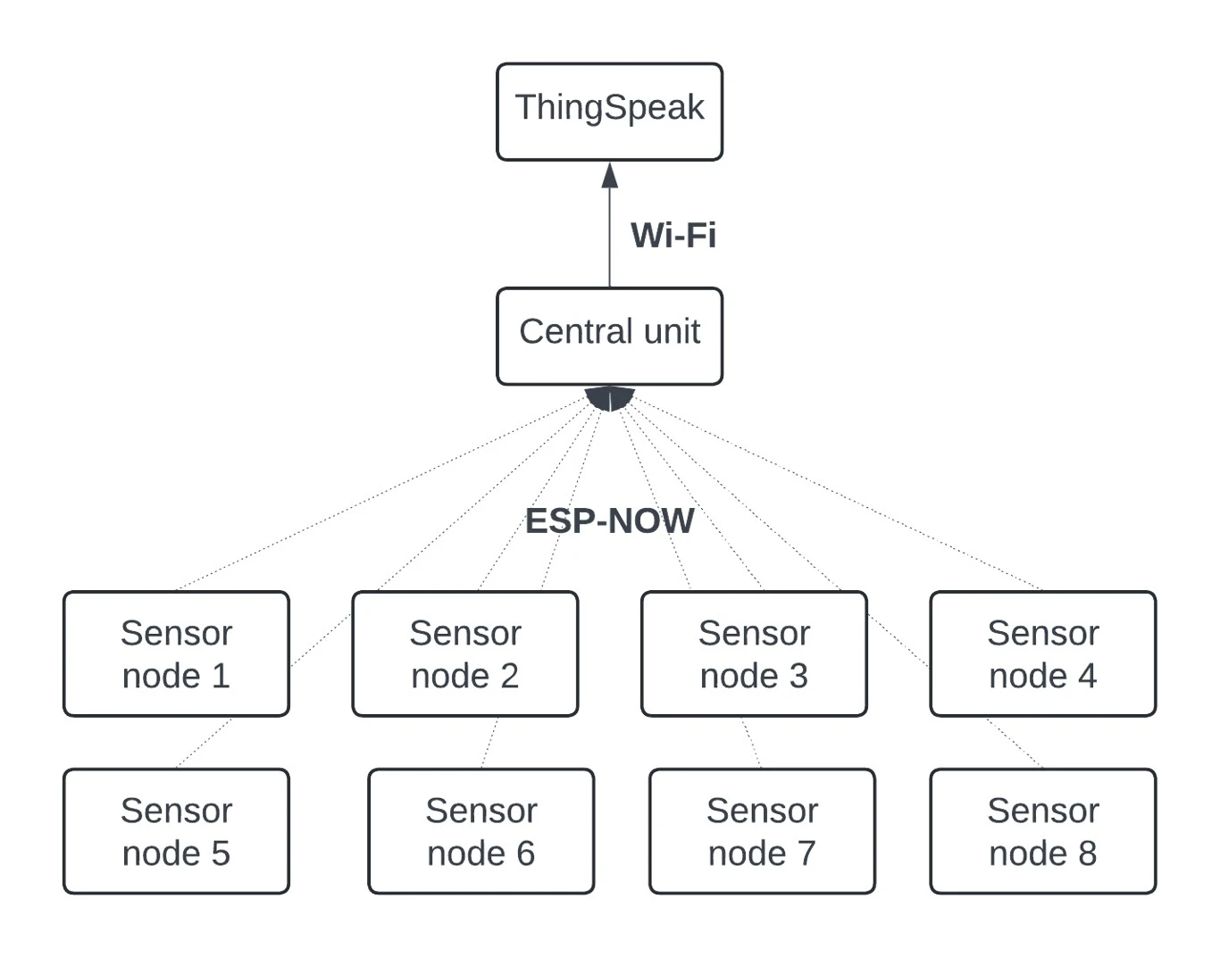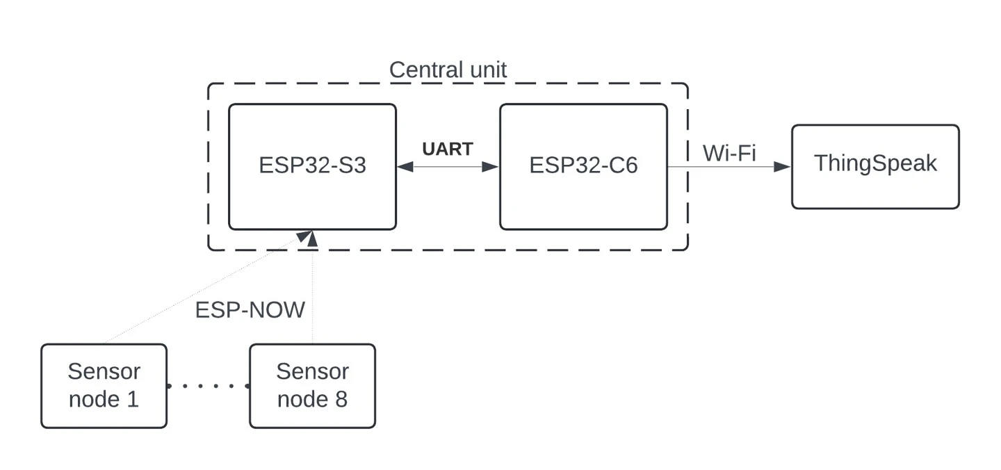 Our network concept consist of 8 sensor nodes based on ESP32 simulating sensor data, and central node - based on ESP32-S3 and ESP32-C6 combination. Block scheme is on following figure.