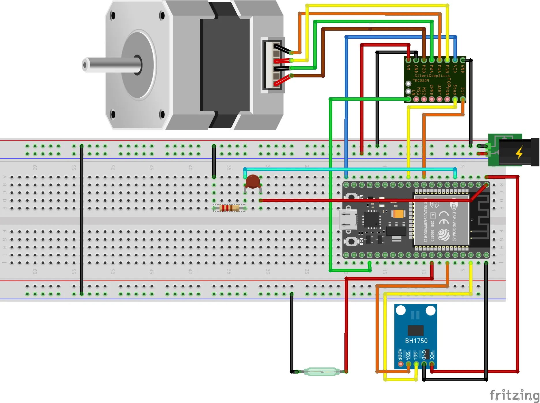 - DC/DC buck converter converts 12V powering the Stepper motor into 5V, which powers the ESP32-DevKitC