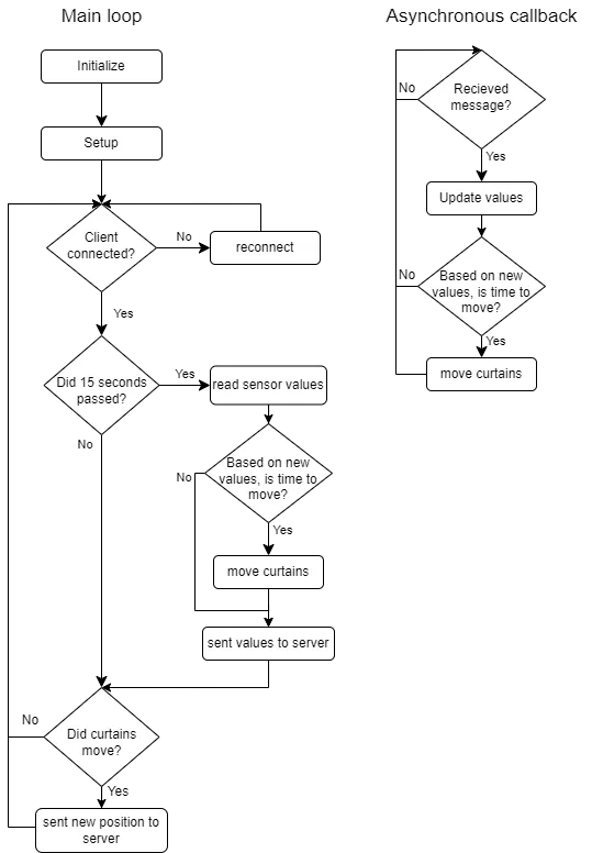 Home Assistant provides friendly GUI, where the user can change and set values of desired modes. When the whole system is fully initialized, there is an asynchronous function callback, that process an incoming message and based on the topic changes the relevant values. The program cycles in an infinite loop and processes the position of the curtains based on the active mode, sensor values and actual position. It also reads new sensor data every 15 seconds, which is sent to the server.
