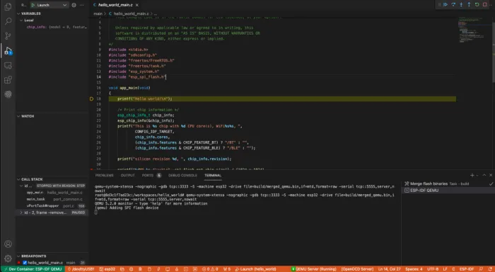 The ESP-IDF: QEMU Manager command____ will____ run the current project application binary in an emulated ESP32. If you execute the ESP-IDF: Monitor QEMU device it will open____ a monitor session to observe the application output. You can also use ESP-IDF: Launch QEMU debug session command to start a debug session as shown below.
