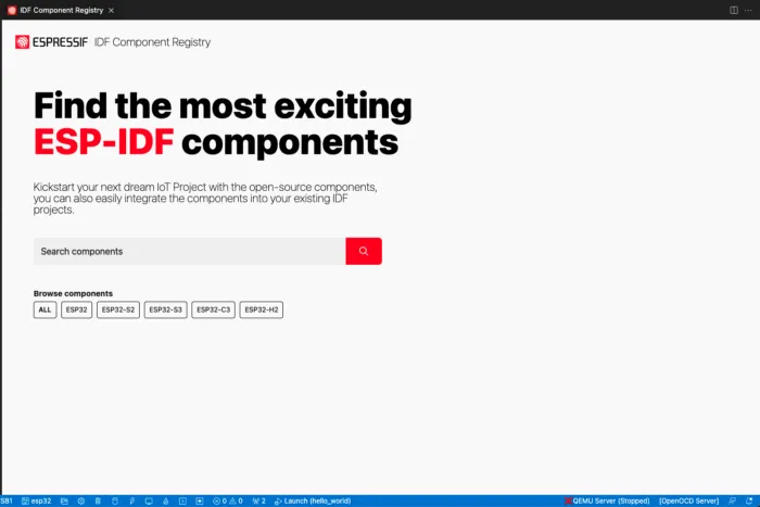 IDF Component registry is integrated into the extension and this allows users to add a component to your project. Run the ESP-IDF: Show Component registry command____ to launch components page.