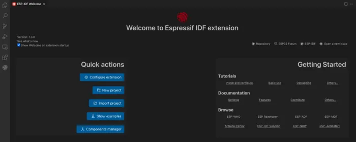 Added a new welcome page with documentation links and buttons for basic features of the extension. You can run the ESP-IDF: Welcome command to launch it.