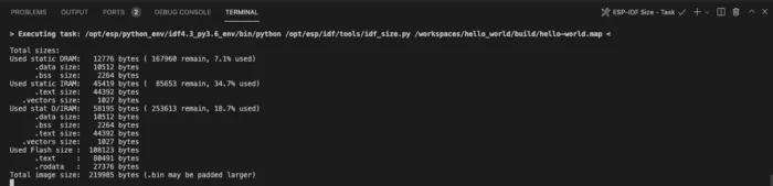 - Added idf-size.py output after build task. This is done after executing the ESP-IDF: Build your project or__ESP-IDF: Build, flash and start a monitor__ command. This will help users to understand the amount of memory used in their applications and reduce the binary size.