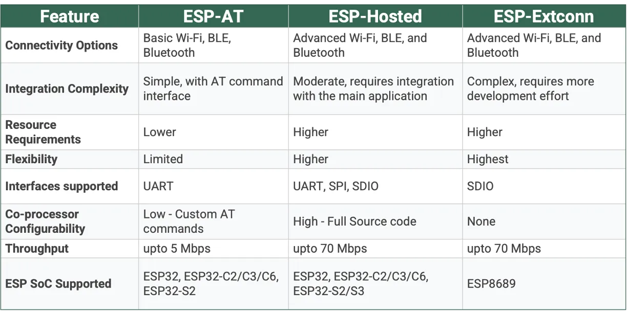 4. Performance Constraints: For high-performance applications, the trade-offs between the solutions should be carefully evaluated. ESP-AT may be more resource-efficient, while ESP-Hosted and ESP-Extconn will provide better performance and throughput.