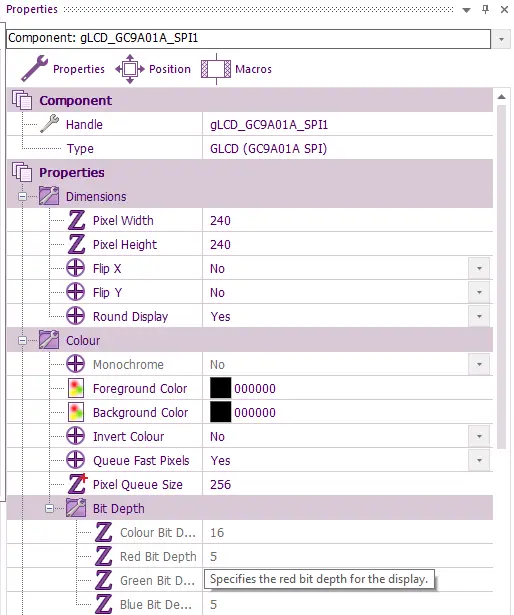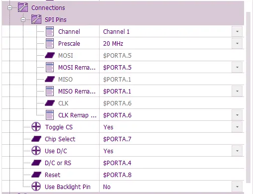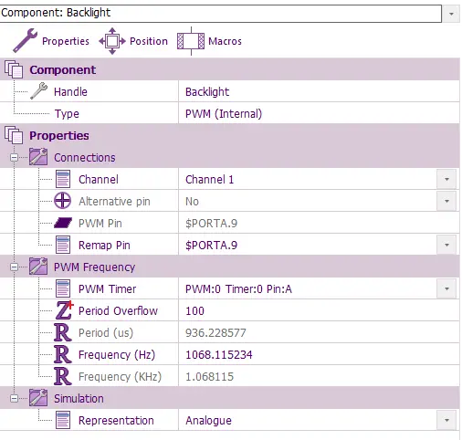 First set up the panel in Flowcode as above: PWM channel connected to PortA.9 (GPIO9) This allows us to control the brightness of the display.