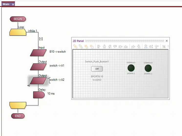 Start a new M5stack Dial program in Flowcode. Add a switch and a LED to the 2D panel and create the program you can see here.