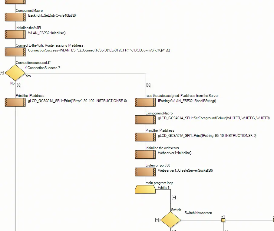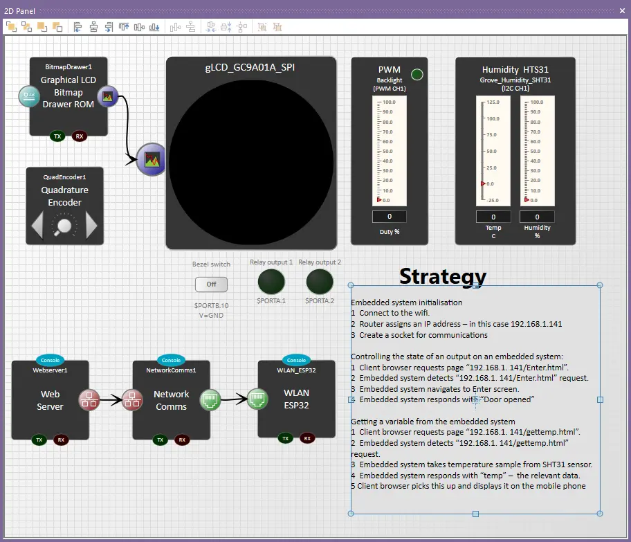 This builds on the panels in the previous programs. To the panel we have added a Web server, a Network comms layer component and a Wireless LAN component for the ESP32 chip. They all link together.