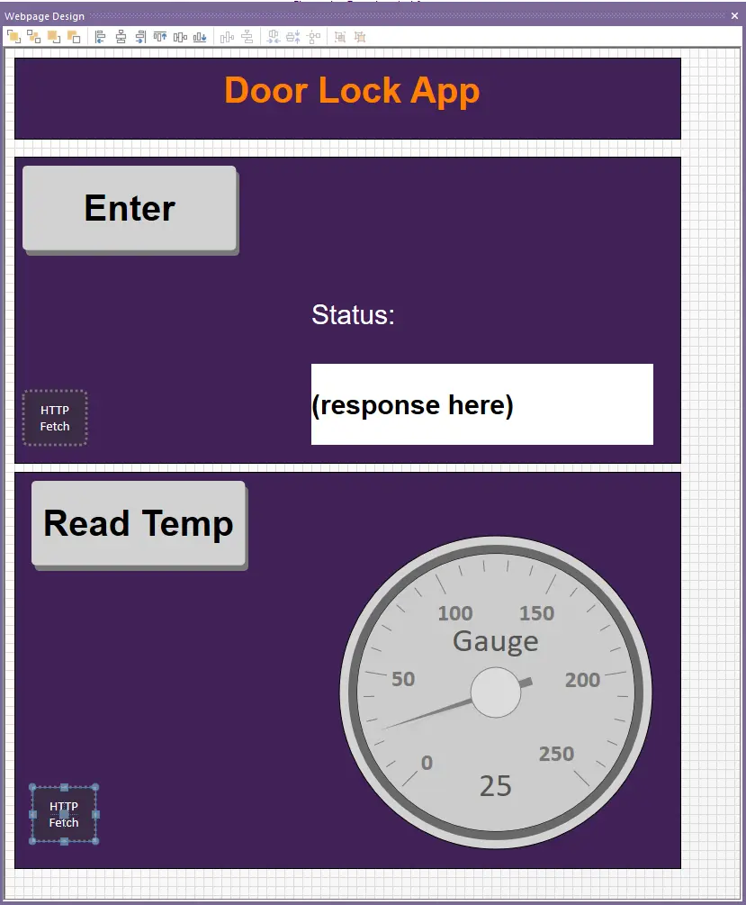 It contains an Enter button, A text field, A HTTP Fetch command component - FetchForEnter - a read Temp button, a
