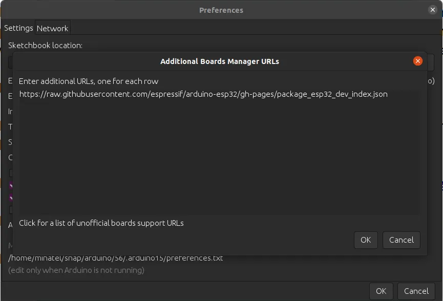 Add the “https://raw.githubusercontent.com/espressif/arduino-esp32/gh-pages/package_esp32_dev_index.json ” to Additional Boards Manager URLs and click OK.