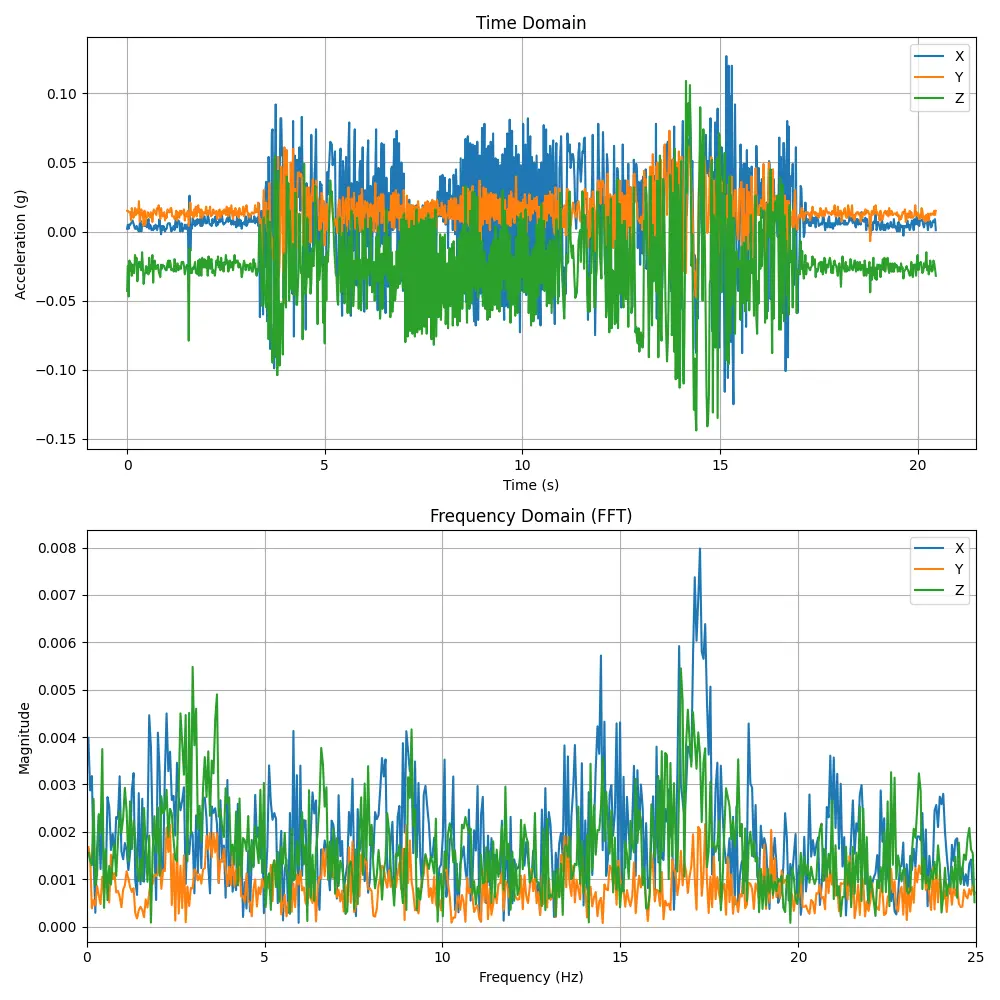 • IMU sensor integration: Implemented MPU6050 accelerometer support via I2C for vibration measurement