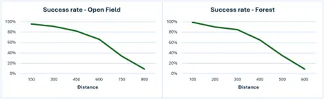 Success rates in open fields remained high at close ranges but fell to around 60% by 150 meters. In forested conditions, Wi-Fi success rates declined more quickly, dropping below 50% at 80 meters, highlighting its vulnerability to obstructions.