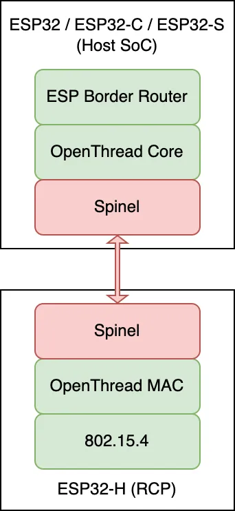 In the solution, the Host Wi-Fi SoC operates the Espressif Thread BR and OpenThread Core stack, while the 802.15.4 SoC runs the OpenThread RCP (Radio Co-processor). Communication between the two is established through the Spinel protocol.