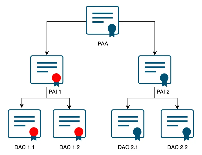 When a certificate is revoked, all the certificate’s issued under it, including itself, will be revoked, i.e., if a PAI is revoked, then the PAI and all the DACs issued under it will stand revoked irrespective of their scheduled expiry.