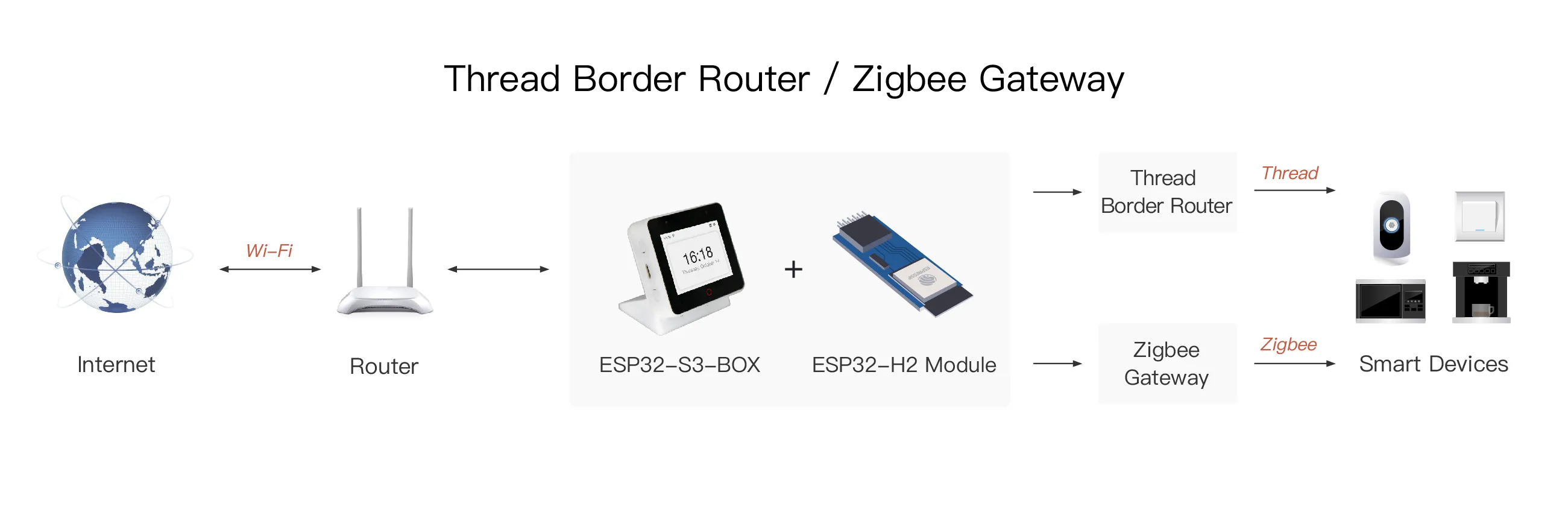 For instance, we can combine ESP32-S3-BOX with the ESP32-H2 module, which supports 802.15.4 (Thread 1.x/ZigBee 3.x) and Bluetooth 5 (LE), to build a Thread Border Router that connects a low-power Thread network to a Wi-Fi network. The router can also work as a Zigbee gateway, allowing users to control Zigbee devices through Matter, a connectivity protocol for smart home.